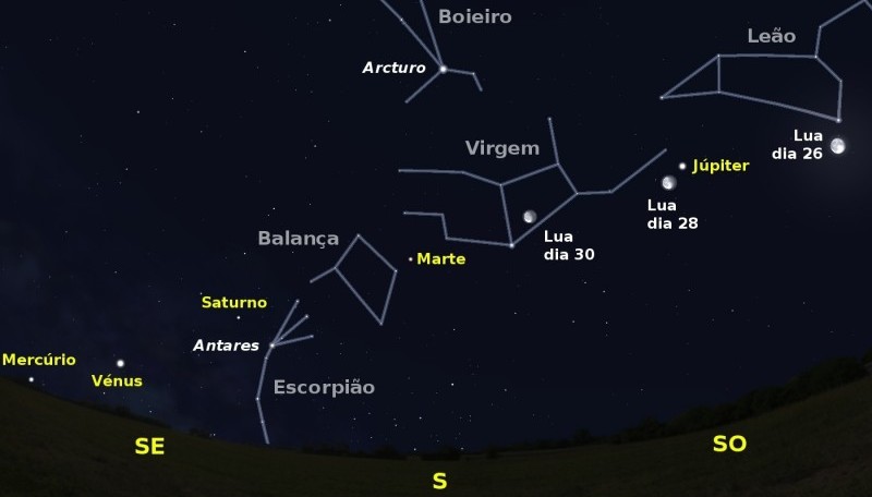 Ao longo de todo o mês podemos ver como Vénus se vai deslocando aos poucos para leste, ultrapassando Saturno no dia 9. Junto a eles iremos encontrar uma estrela que pela sua cor e posição é conhecida como o coração da constelação do Escorpião: Antares.
