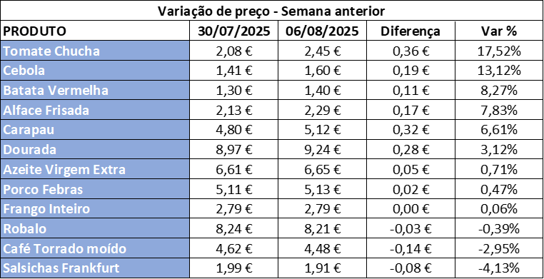 Os produtos com maior variação de preços face à semana anterior, ao último mês e aos últimos três anos, são: