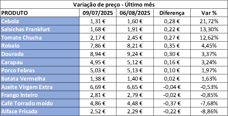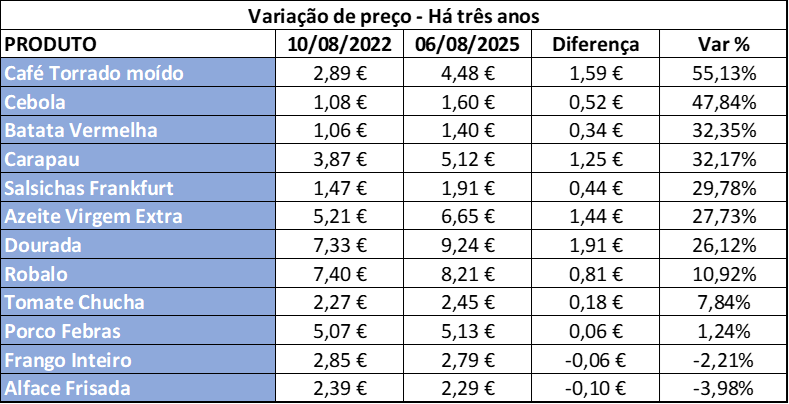 · Entre o dia 10/08/2022 e o dia 06/08/2025 existe uma diferença de 8,39 € quando comparado o mesmo cabaz nos 2 dias (19,55%).